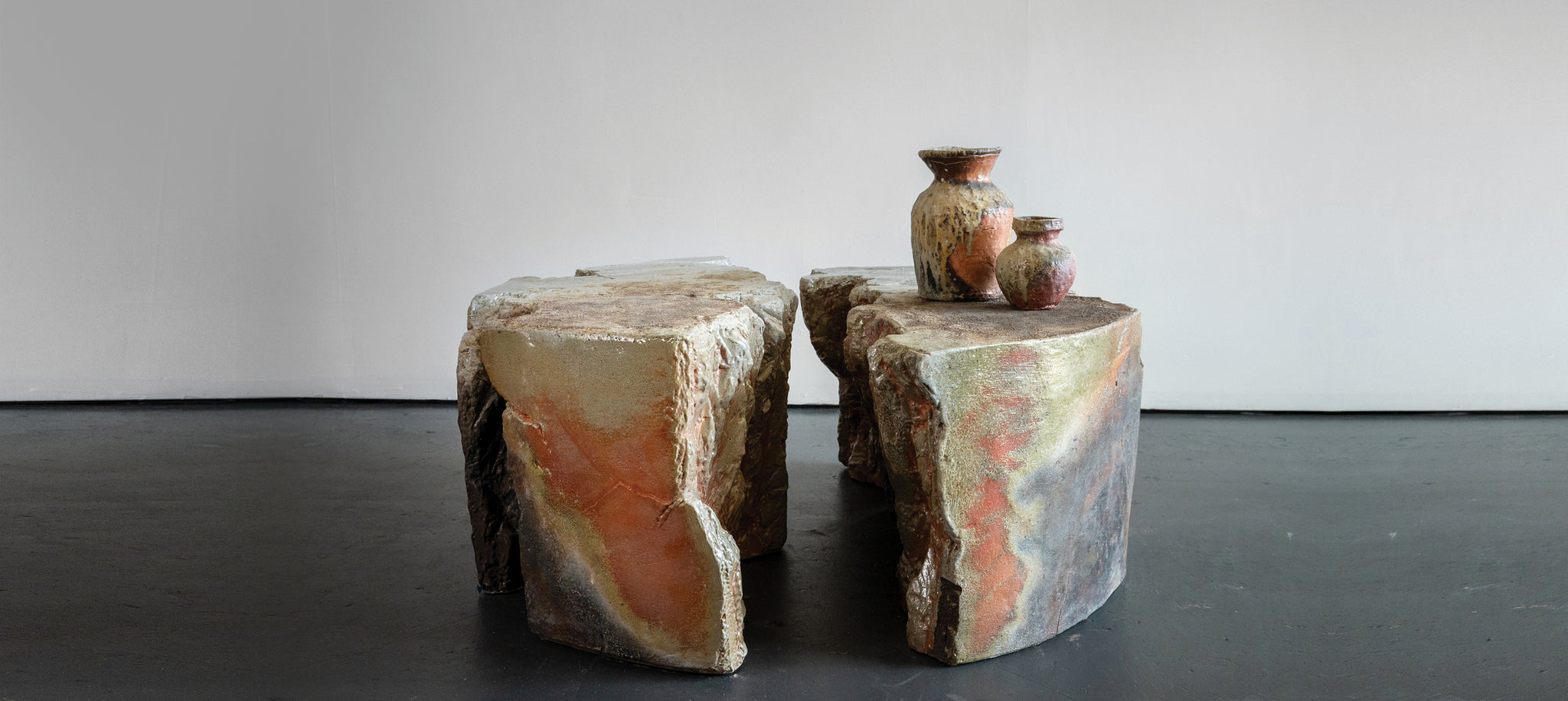 In Zablocki’s work, one sees the inherent brutality of ceramic furniture. There is a rawness, a brokenness, to the pieces, as if they are found objects: many of the works feel like architectural remnants, ancient rock formations cleaved from the side of a mountain, or mined from a mountain quarry. In this, one sees a dialogue between the organic elements Zablocki encounters on frequent, strenuous backcountry excursions and the primordial materiality of clay. There is also the sheer physicality their making requires of him. Pieces of this ambitious scale are only made possible by the massive anagama wood-burning kiln Zablocki uses, one of the largest in America. Over the course of three firings, each one ten continuous days and nights, he and a team of assistants tend the roaring flames, keeping them alive with more than 11 cords of locally sourced wood, and listening for distinct sonic cues that indicate when more fire or air is needed. The work is as much an homage to earth’s rhythms as it is a product of them.