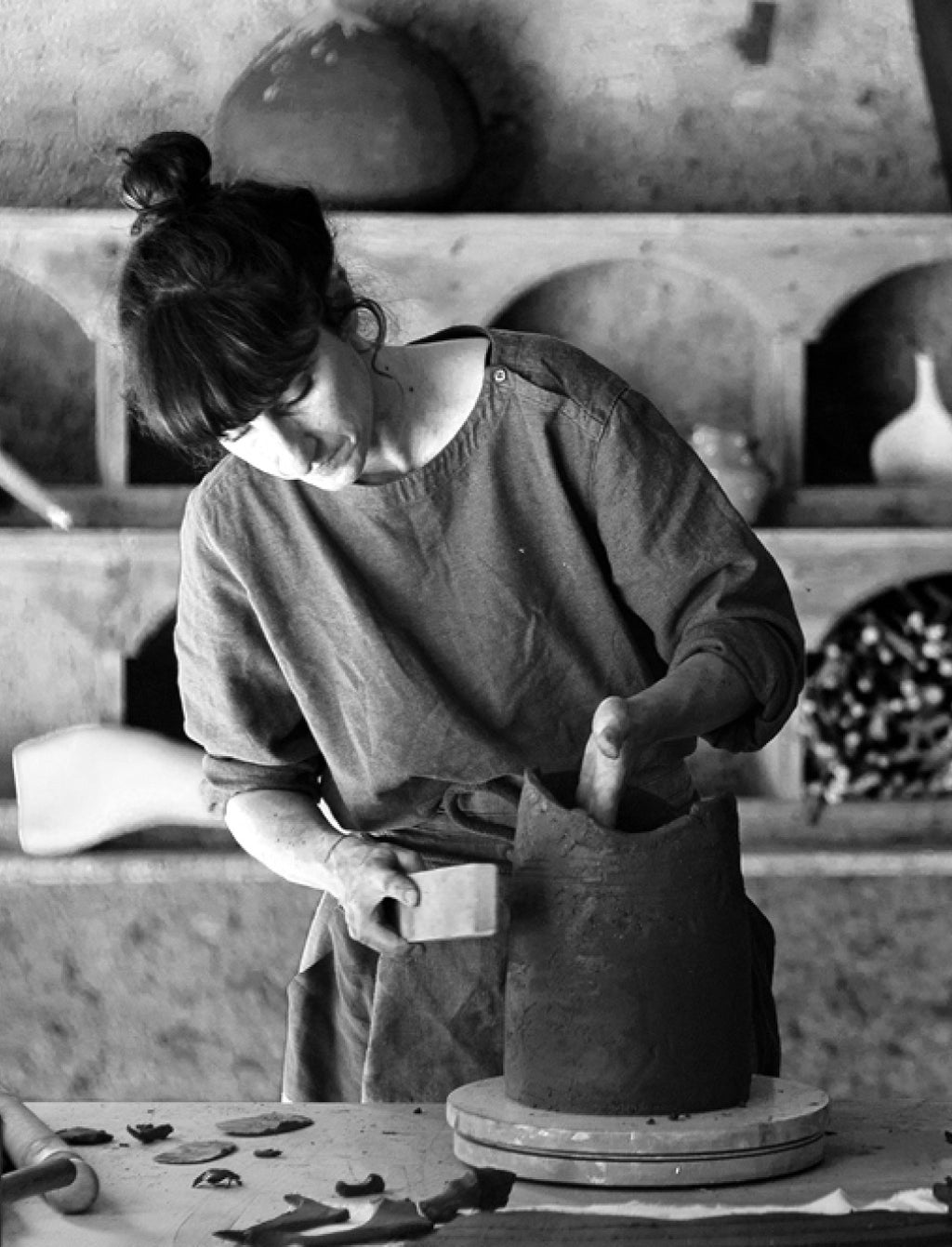 LEFT: FRENCH ARTIST LUDMILLA BALKIS IN HER STUDIO IN THE BASQUE COUNTRY. RIGHT: ‘MENDIAK’ (2025), SANDED WHITE STONEWARE.