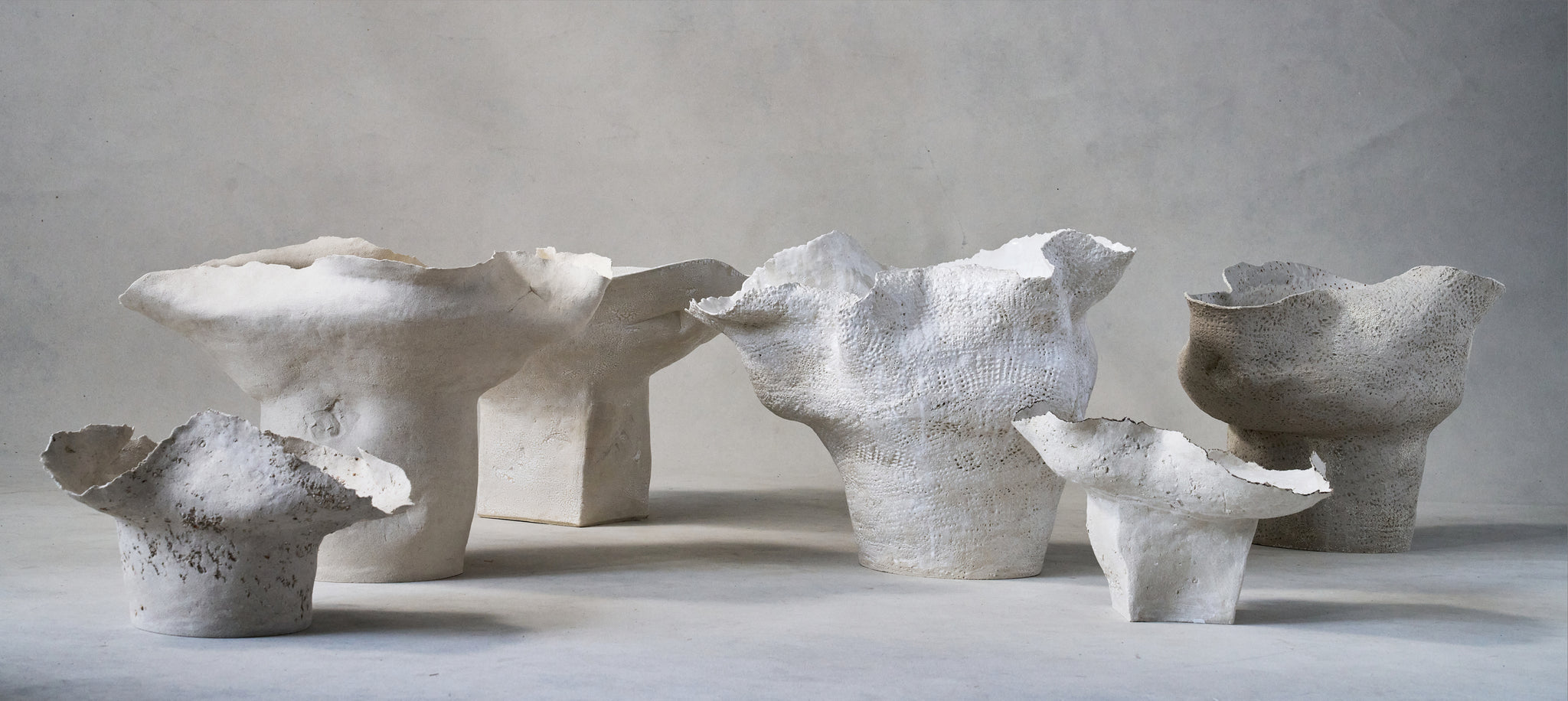For her latest Guild Gallery exhibition, Balkis also incorporated local ferns, hay, and fig tree branches, dried and reduced to create the layered pale glazes that define the collection’s distinctive palette. Balkis has developed a precise, highly disciplined approach to working with clay. With each sculpture, she asks herself: How far can I go before it collapses? Centimeter by centimeter, she coaxes the material to dry in phases to prevent structural failure.