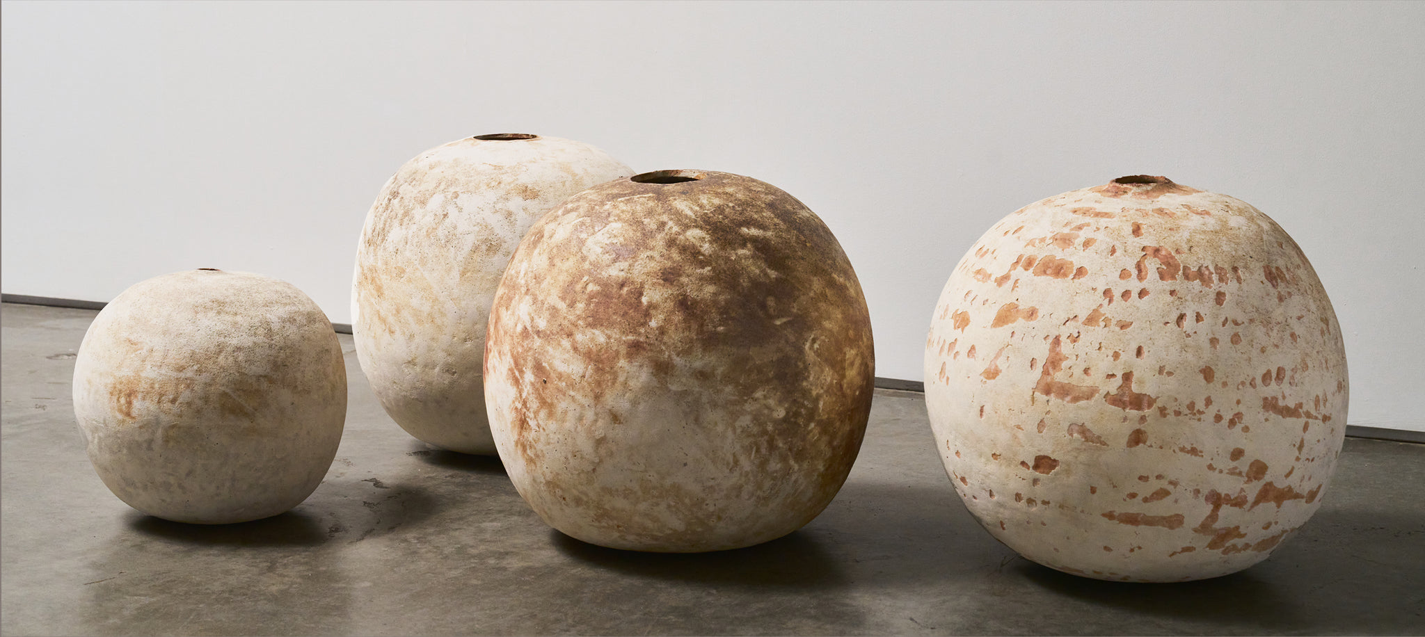 LEFT: DETAIL OF LUDMILLA BALKIS, UNTITLED NO. 1, 2025. RIGHT: MOON JARS BY LUDMILLA BALKIS