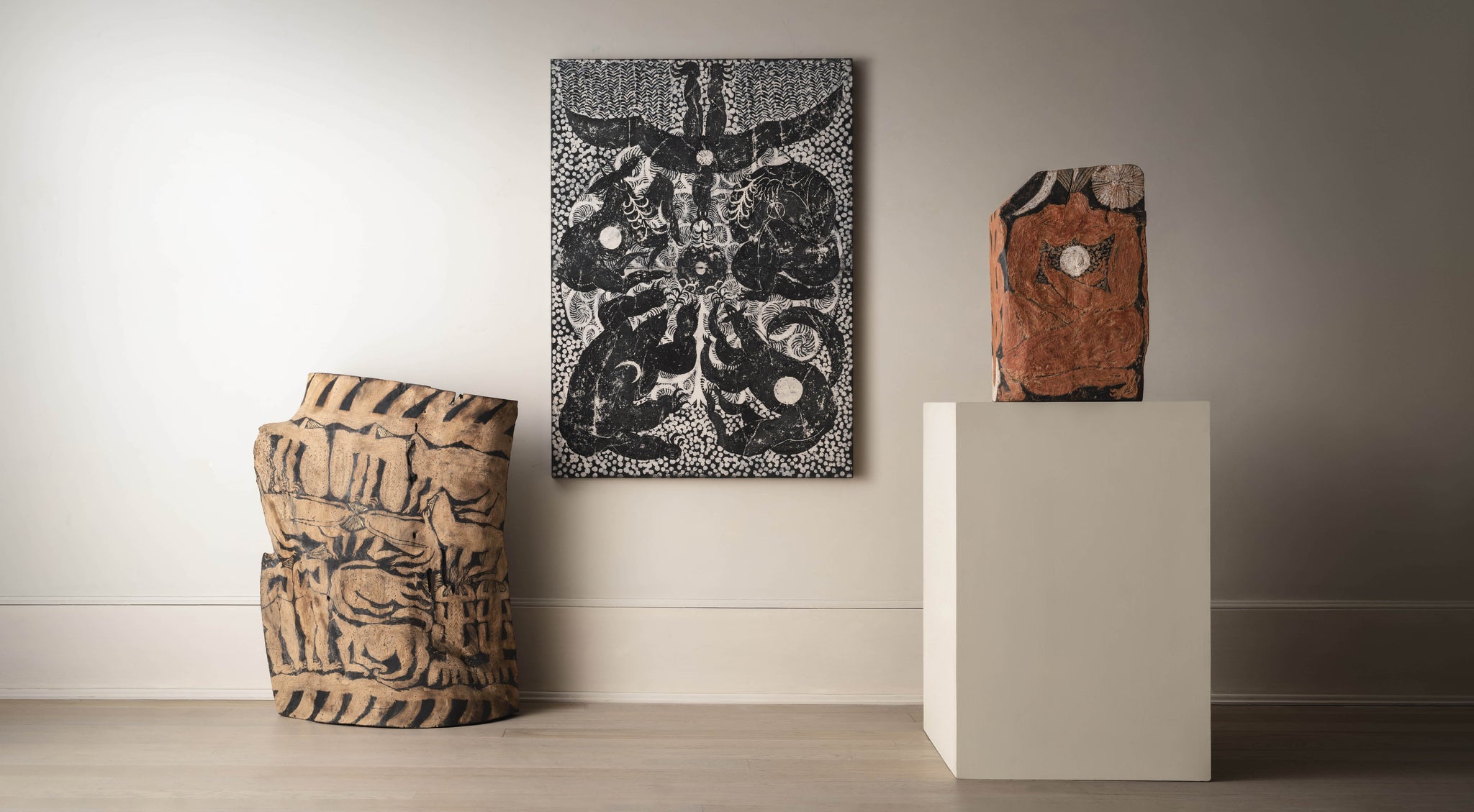 A palette of dark and light in high contrast is consistent throughout the works, which Syotatsu attributes to the observation of shadows and the patterns in which day and night flow throughout space, as though “the sun and moon are in conversation with each other.” This distinctive combination creates a textured surface and matte quality while infusing his work with the energy of the land around him: the light, the sounds of animals, wind and rain, and the hum of everyday life. Syotatsu begins creating without a specific outcome in mind, but rather looks to the medium to reveal natural shapes over time, then connects those forms with the otherworldly visions he encounters in his dreams and in his daily exchanges with the land, binding tangible and spiritual senses into a physical work. The result is a manifestation of Syotatsu's own relationship to nature—one of wonder, appreciation and respect expressed through his subjects—abstracted to enlarge their ethereal energy and capacity for emotional transference.